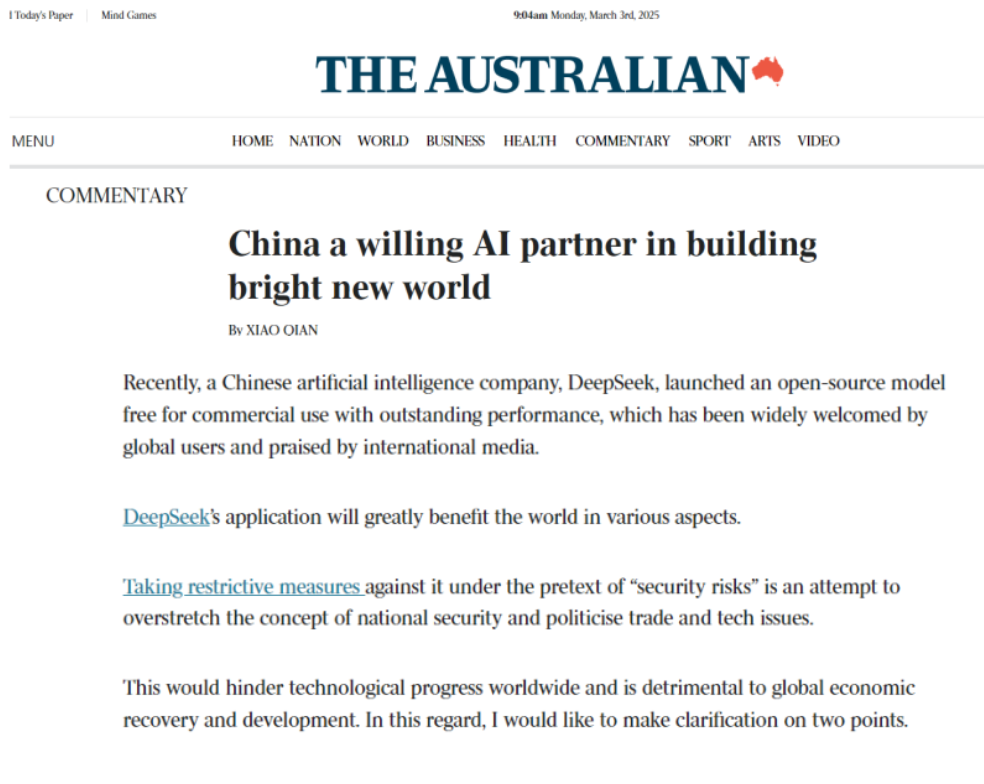 澳洲都市报3月4日消息(记者 孔博)中国驻澳大利亚大使肖千于3月3日在澳洲主流媒体《澳洲人报》评论版发表署名文章《携手迈向更加美好的智能未来》,强调人工智能(AI)作为全球科技发展的核心动力,正深刻改变世界经济与社会格局。他特别提及中国AI企业深度求索(DeepSeek)在推动全球AI普及方面的贡献,并呼吁中澳两国加强人工智能领域的开放合作,共同打造包容、安全、创新的技术发展环境。