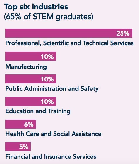 STEM专业毕业生分布在多种行业,其中大部分人为专业技术人员,占55%,18%为经理职位。